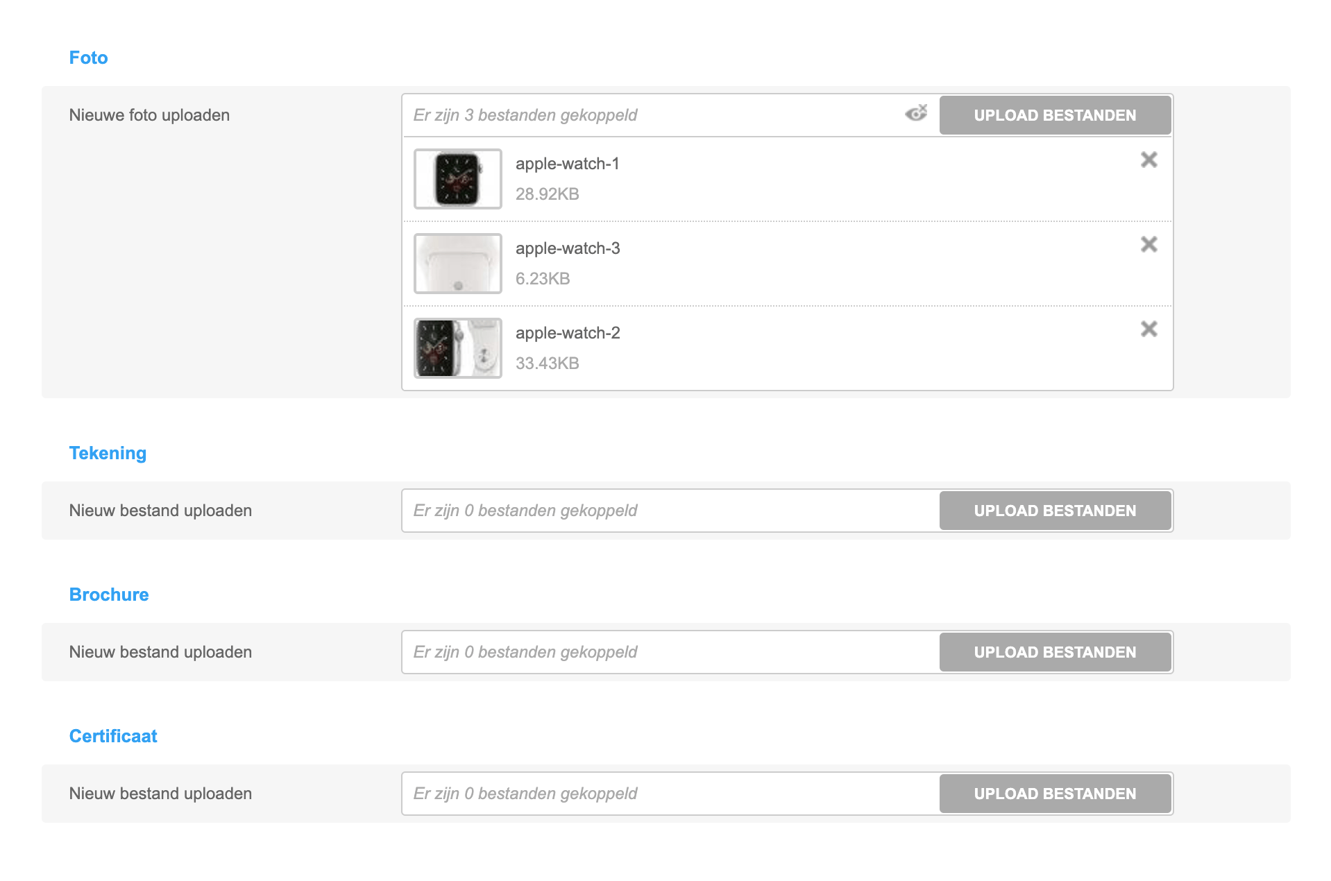 Naast afbeeldingen kunnen ook andere soorten bestanden worden geplaatst bij een product. Zoals: tekeningen, brochures en certificaten.