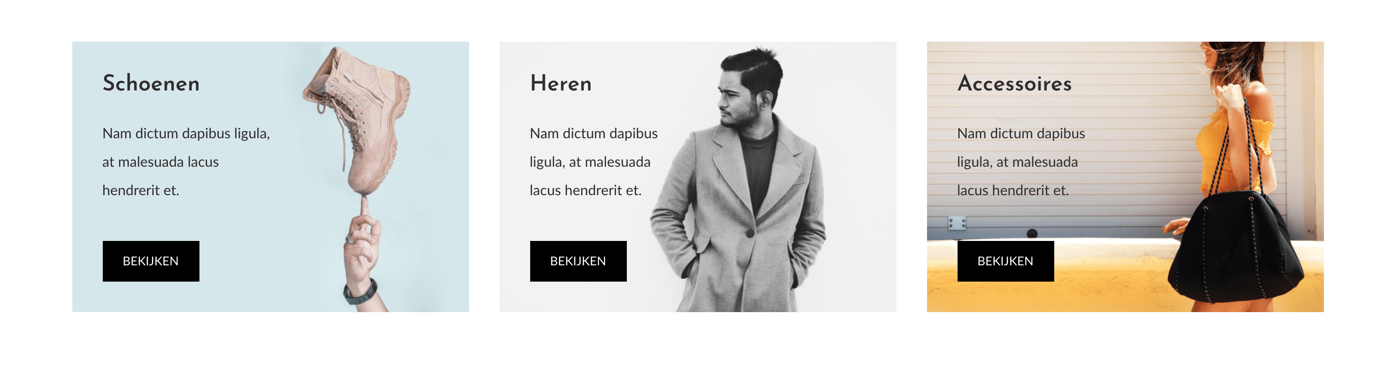 Het showcase blok op de homepage bestaat uit drie kolommen waarbij bij ieder blok een achtergrondafbeelding heeft. Deze achtergrondafbeelding dient te worden geupload in het formaat 1000 x 667 pixels.